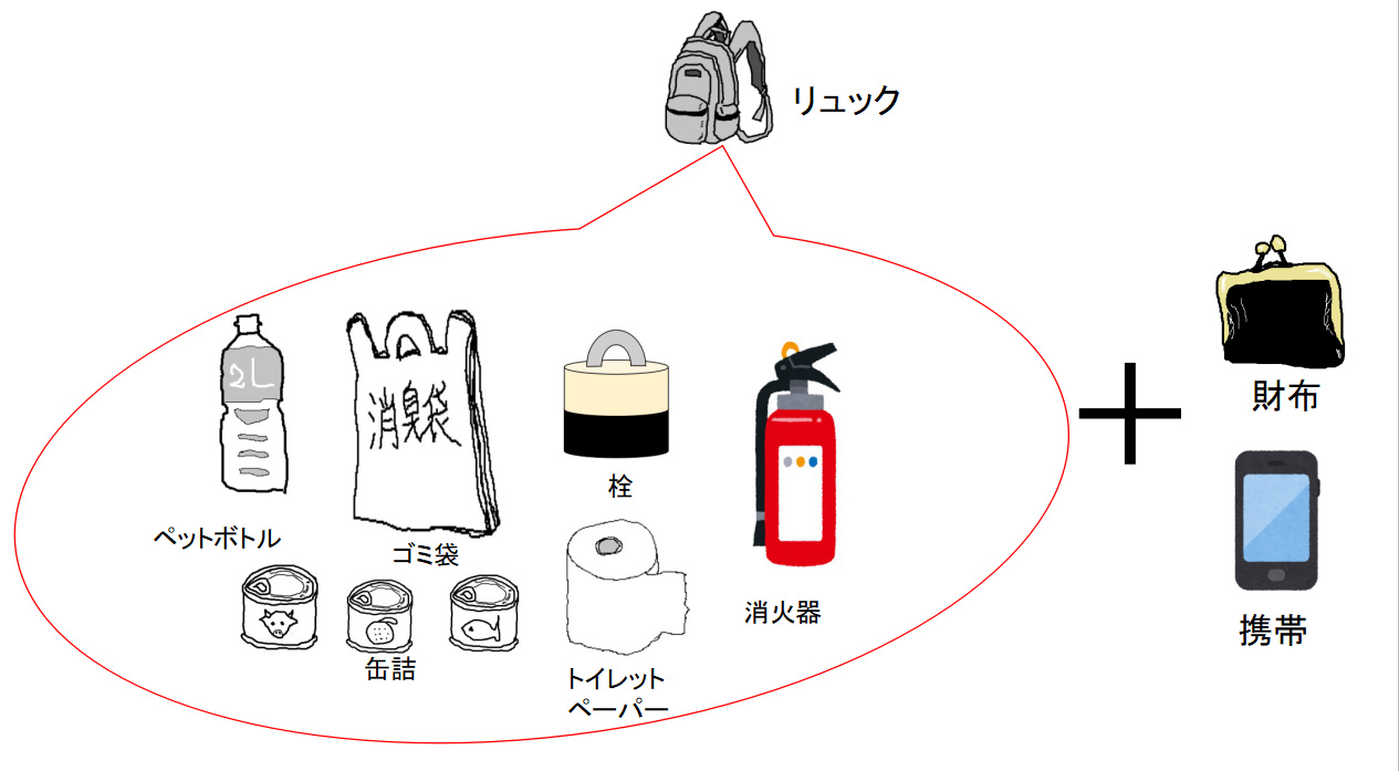 (リュック、2Lペットボトル、缶詰、トイレットペーパー、ゴミ袋、栓、消火器、硬貨、財布、携帯)